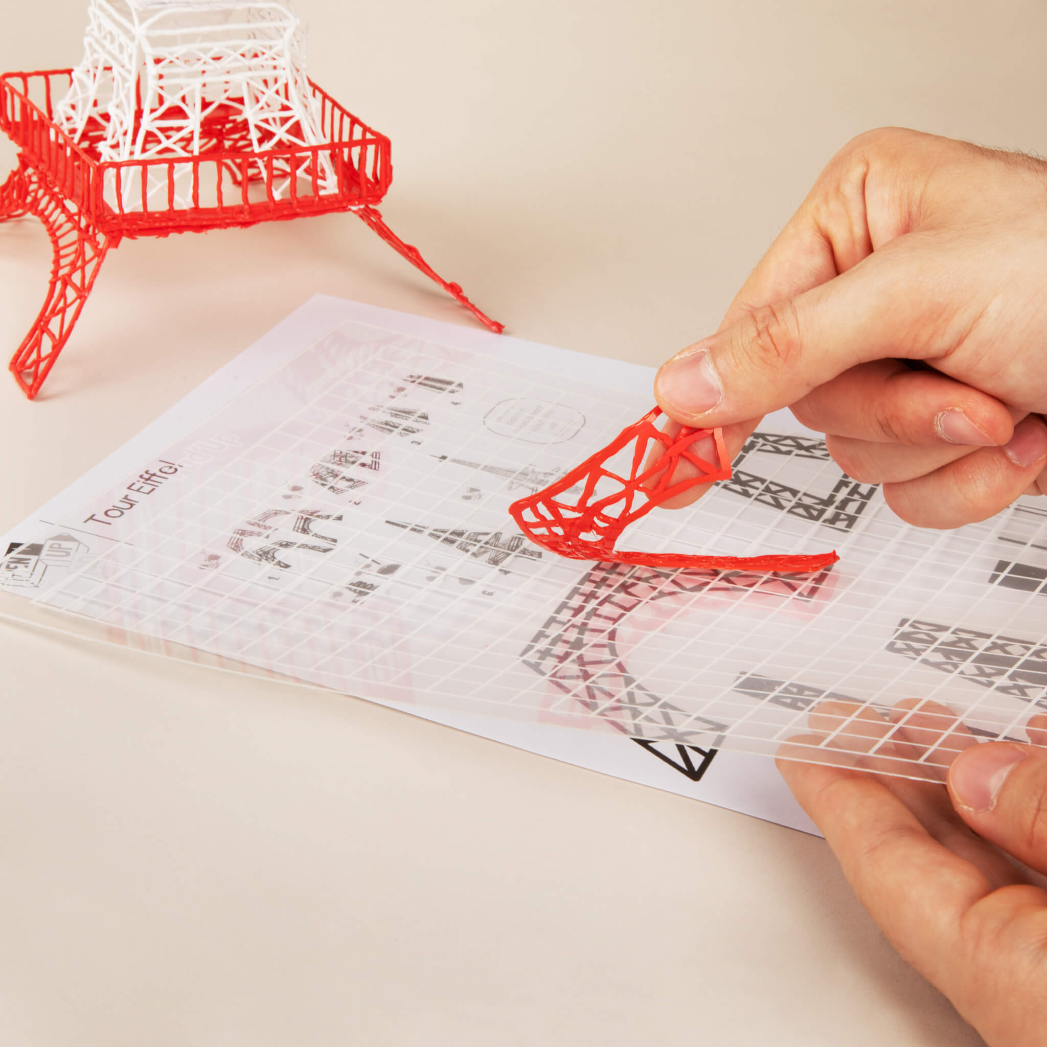 Placez un pochoir Pad'Up sur la feuille afin d'éviter que le fil ne colle au papier. Utilisez votre Pen'Up pour dessiner les contours de votre modèle, ici, la Tour Eiffel.